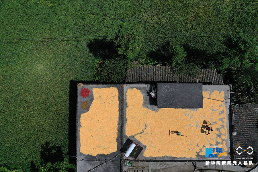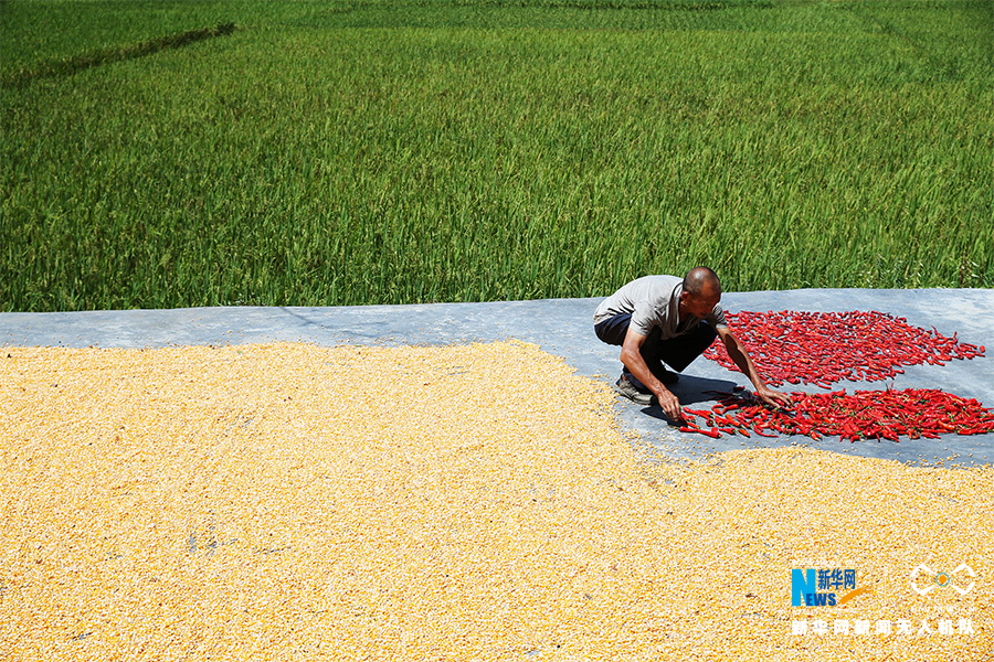 重庆市黔江区马喇镇莲花社区,村民晾晒玉米等农作物。新华网发(杨敏 摄)