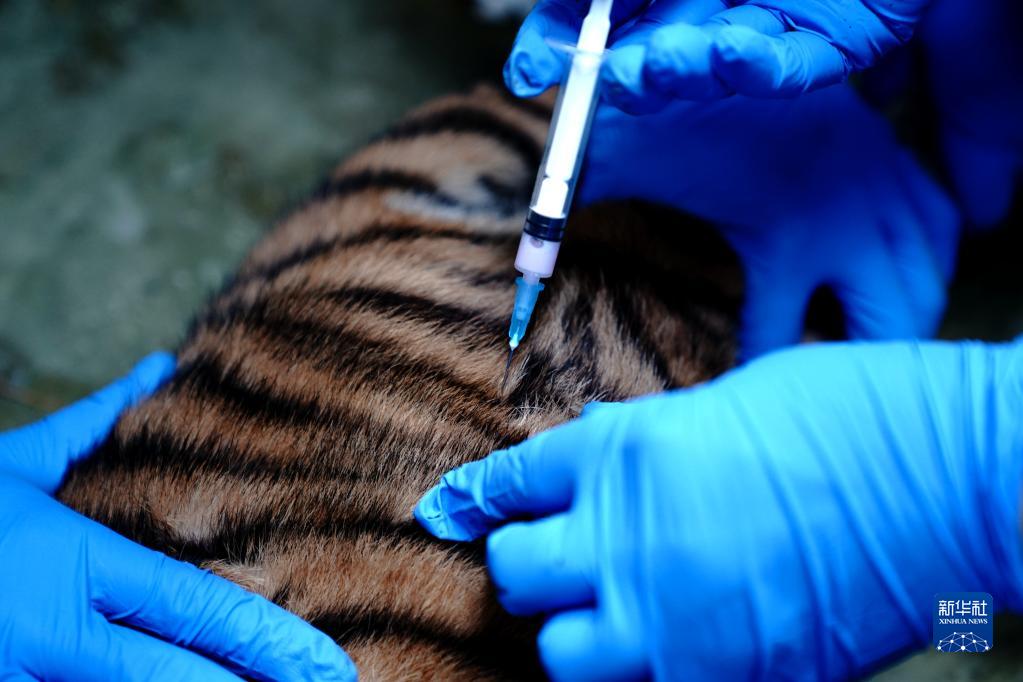 当日,上海动物园兽医给两只小华南虎植入芯片,进行谱系管理并接种疫苗。华南虎是中国特有的虎亚种,又称“中国虎”,是国家一级保护动物。