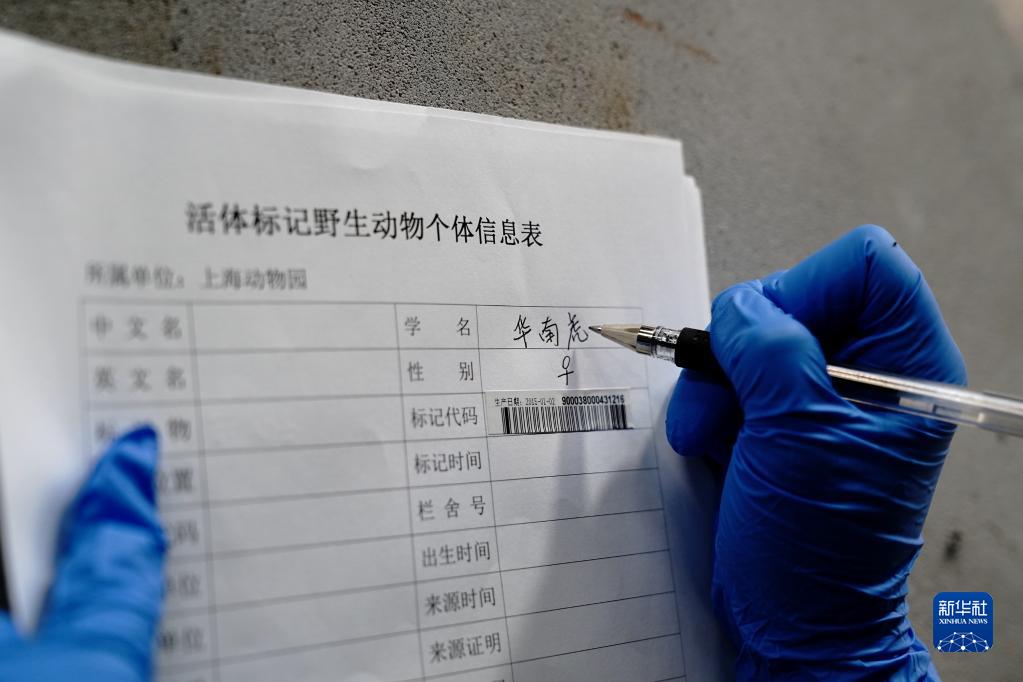 9月22日,上海动物园兽医在登记植入了芯片的小华南虎身份信息。