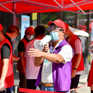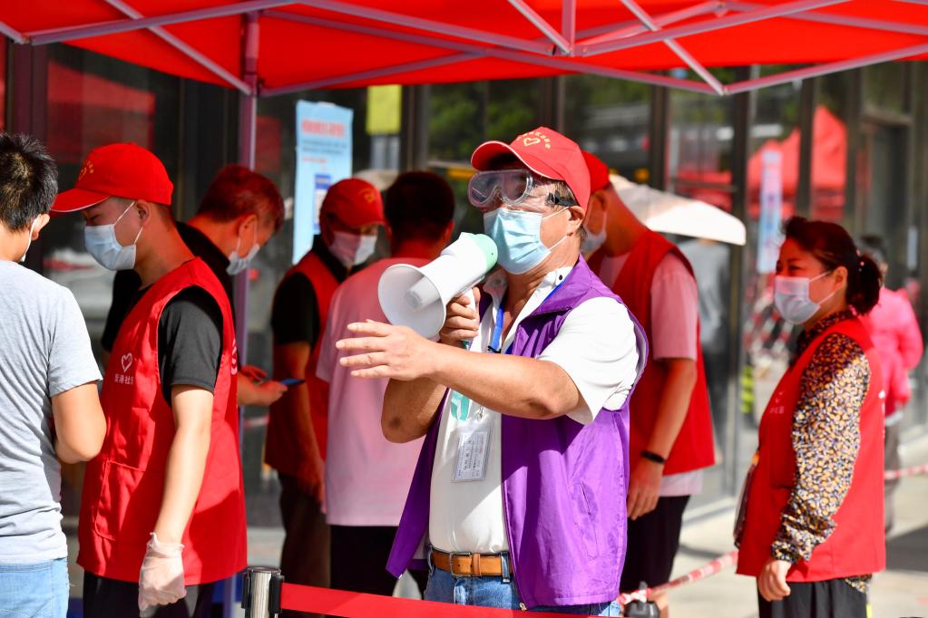 “来,请往内线走。小心绳索,不要绊倒了。请打开您的健康码……”在思明区新港社区核酸检测点,台胞毛维林穿着紫色马甲,戴着口罩和防护眼镜,手拿扩音喇叭,一遍遍地提醒着前来做核酸检测的民众。烈日下,他早已大汗淋漓。