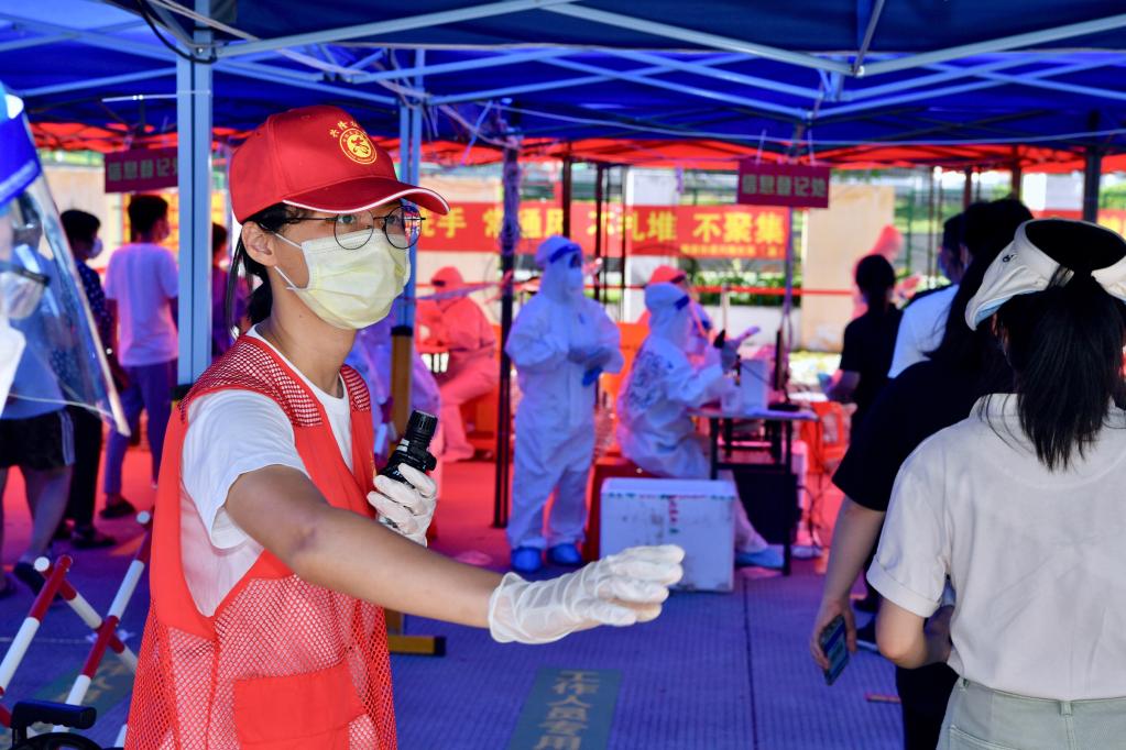 在湖里区兴隆社区的厦门三中核酸检测点,来自云林的女孩张语真拿着话筒,耐心地引导市民排队。