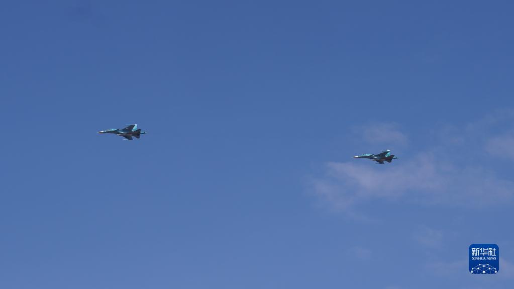 9月23日,在俄罗斯奥伦堡州东古兹靶场举行的“和平使命-2021”上海合作组织联合反恐军事演习实兵实弹演习中,多国联合部队战斗机升空作战。新华社记者 梅世雄 摄