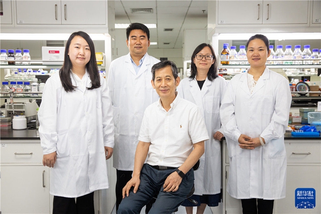 科研团队乔婧科研助理、蔡韬副研究员、马延和研究员、朱蕾蕾研究员、孙红兵科研助理(从左至右)在中国科学院天津工业生物技术研究所实验室合影(9月16日摄)。新华社记者 金立旺 摄