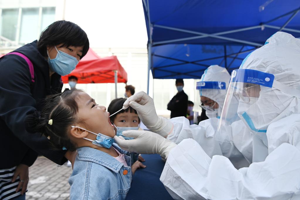 9月23日,在哈尔滨市香坊区一核酸检测点,小朋友进行核酸检测。新华社记者王建威摄