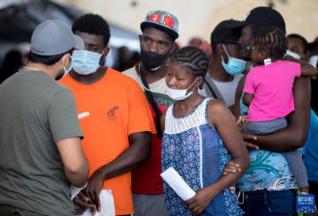 9月25日,在墨西哥阿库尼亚城的移民收容所,来自海地的移民与墨西哥移民官员交谈。