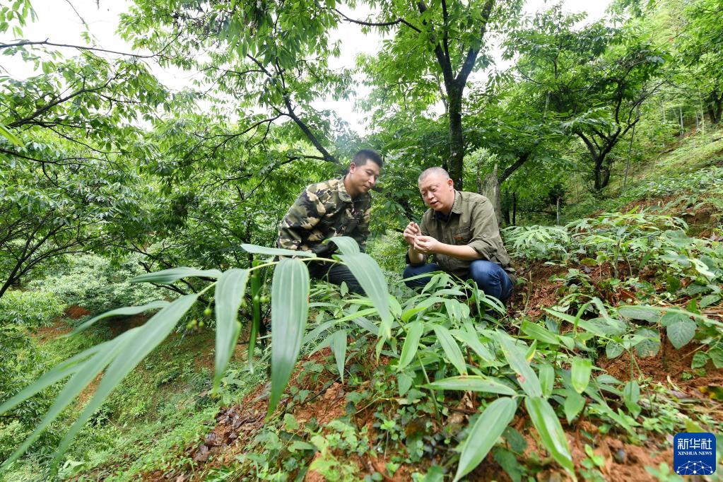 福建建瓯市林权改革发展服务中心的科技特派员陈国兴(右)在建瓯市玉山镇上房村一处林下种植园给村民讲授中药材栽培方法(5月28日摄)。新华社记者 林善传 摄