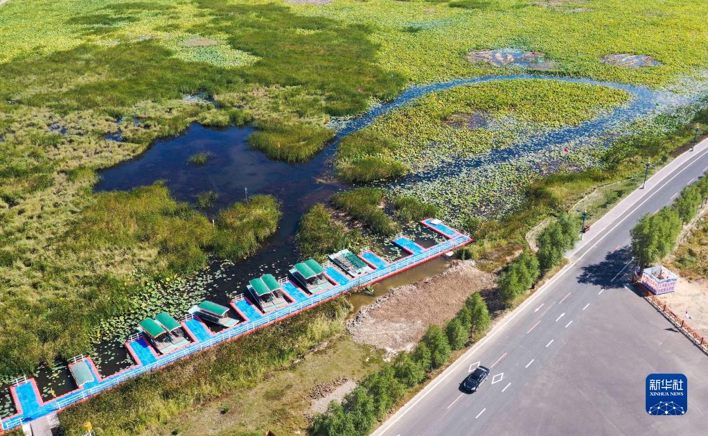 游客在吉林省松原市查干湖参观游览(无人机照片,9月18日摄)。 新华社记者 许畅 摄