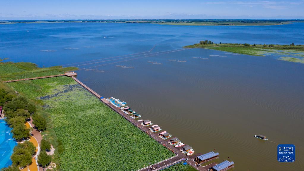 游人乘船游览查干湖(无人机照片,2020年7月20日摄)。 新华社记者 张楠 摄