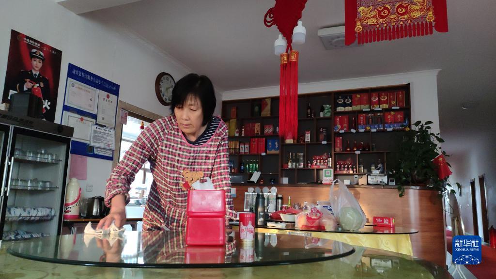 查干湖老关东鱼庄老板娘尚影在饭店内收拾餐桌(9月24日摄)。 新华社发