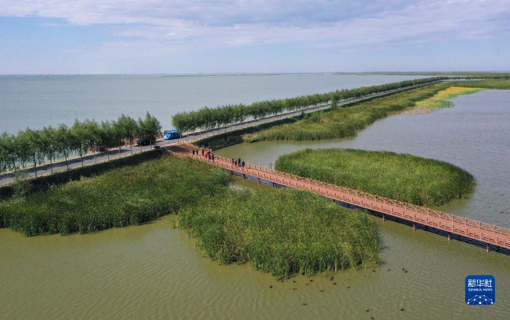 游客在吉林省松原市查干湖野鸭岛参观游览(9月18日摄)。 新华社记者 许畅 摄
