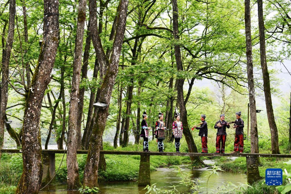 在贵州省江口县寨沙侗寨,演员和村民在小河边排练民族歌舞(4月10日摄)。新华社记者 杨文斌 摄