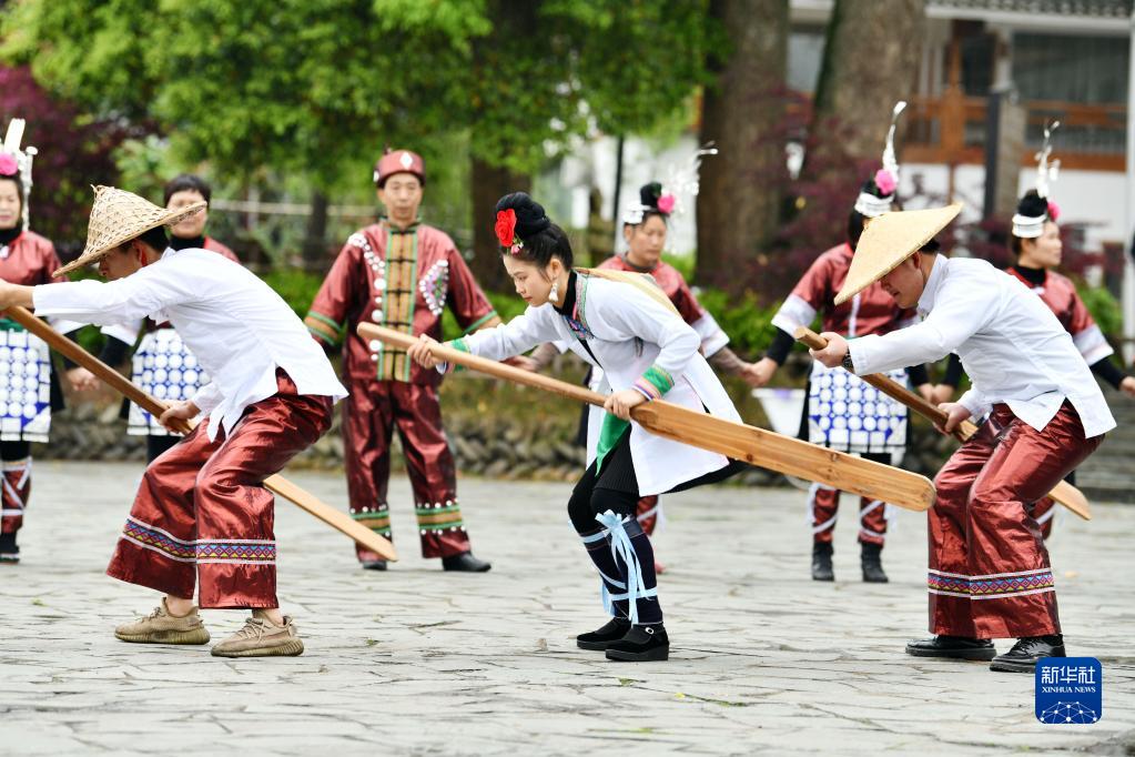 在贵州省江口县寨沙侗寨,演员和村民为游客表演民族歌舞(4月10日摄)。新华社记者 杨文斌 摄