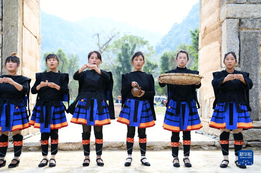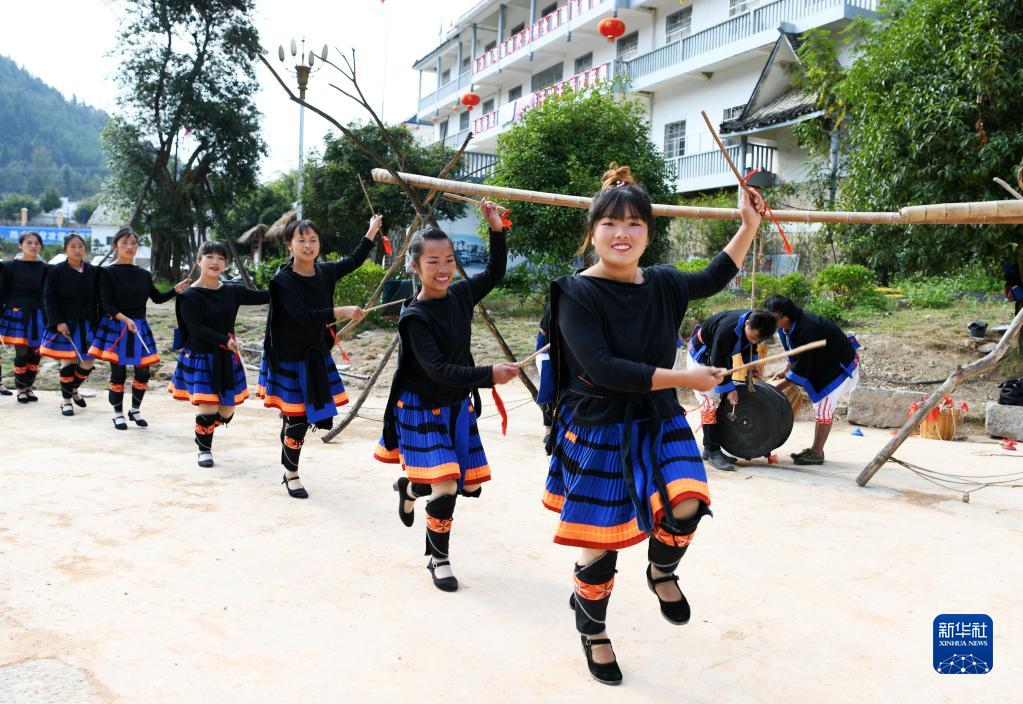 在贵州省荔波县瑶山古寨景区,由搬迁村民组成的文艺表演队为来宾跳猴鼓舞(2019年11月5日摄)。新华社记者 杨文斌 摄
