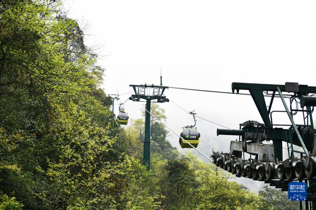游客在贵州梵净山景区乘坐缆车观光(4月10日摄)。新华社记者 杨文斌 摄