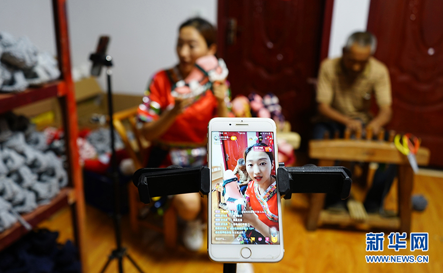 张祖玉通过直播方式售卖草鞋。新华网发 李勇摄