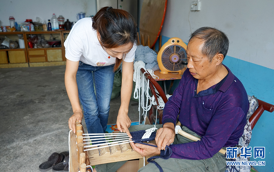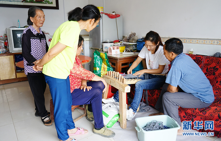 张祖玉指导村民按照新方法编制草鞋,共同增收。新华网发 李勇摄