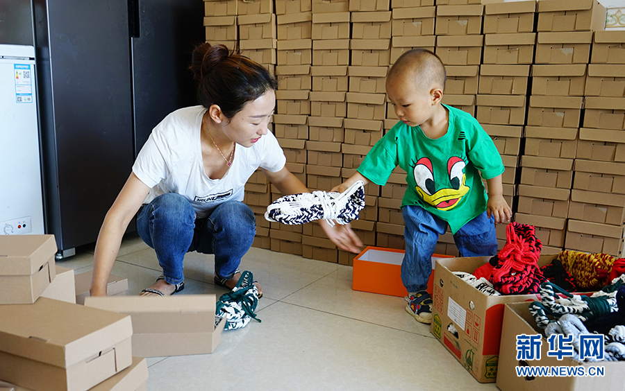 张祖玉整理草鞋,懂事儿子来帮忙。新华网发 李薇薇摄