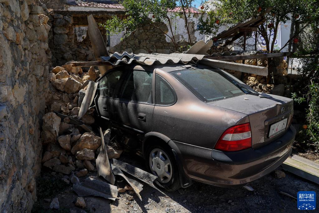 9月27日,在希腊克里特岛,一辆汽车被地震滚落的石头毁坏。
