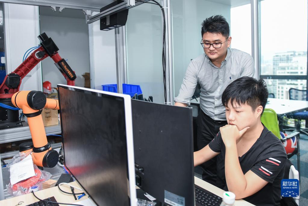 深圳显扬科技有限公司创始人丁克(左)在位于深港科技创新合作区的公司内工作(2020年8月12日摄)。新华社记者 毛思倩 摄