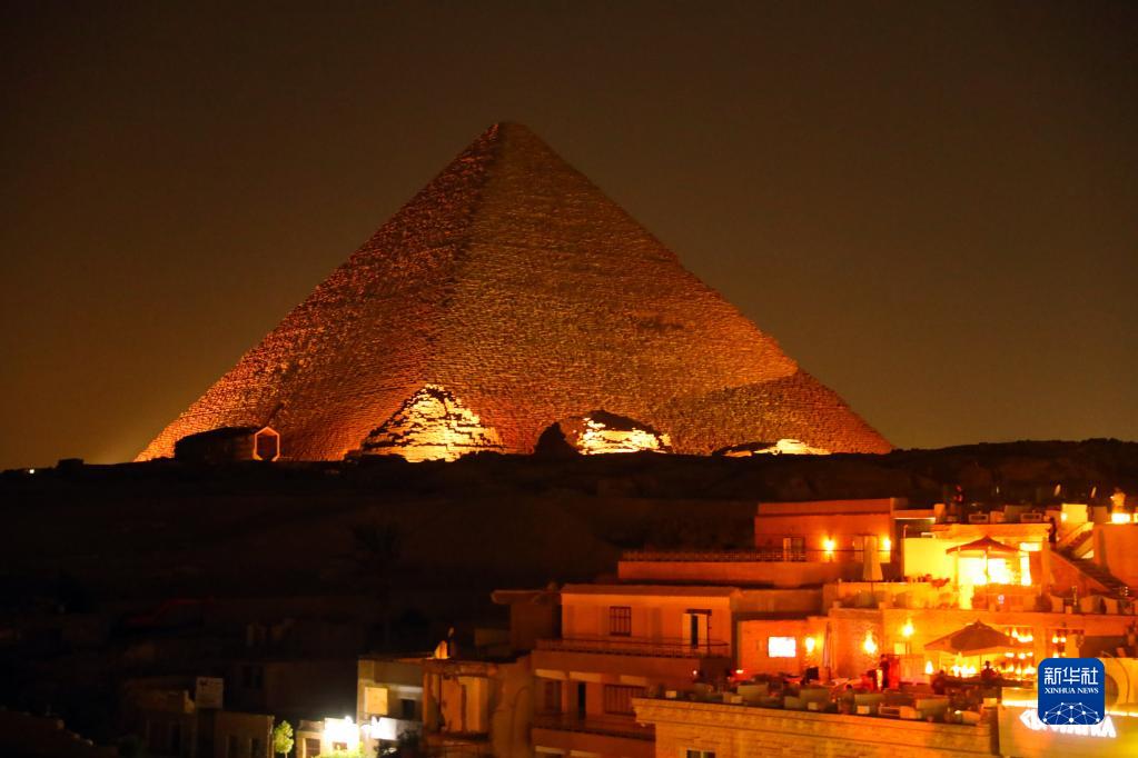 9月27日,埃及吉萨金字塔群景区为游客上演声光秀。