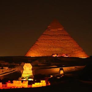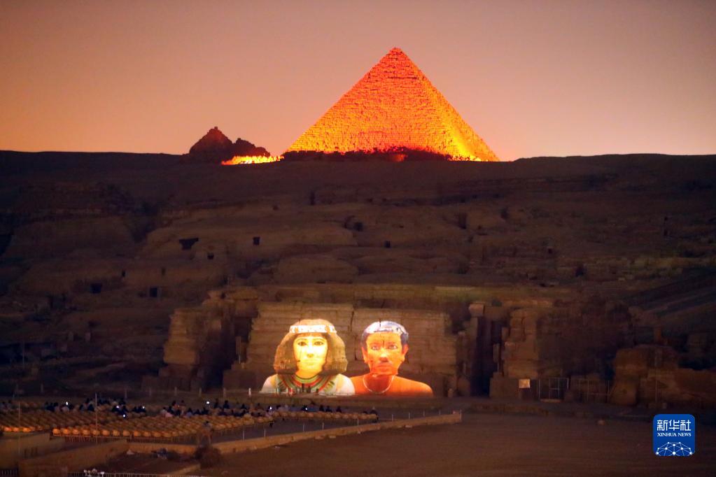 9月27日,游客在埃及吉萨金字塔群景区欣赏声光秀。