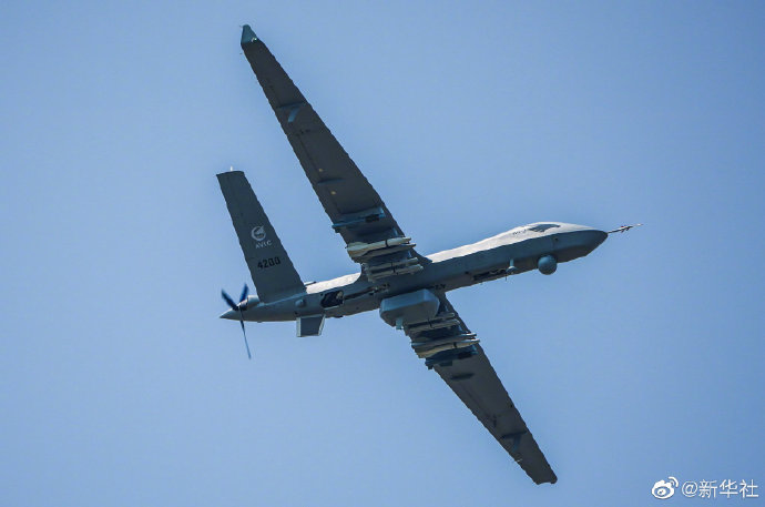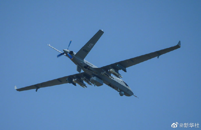 9月28日,由中国航空工业集团研制的翼龙-2无人机精彩完成航展首次无人机飞行表演,为观众展示了无人机系统全自主起降、爬升巡航飞行、空地协同等能力,这是大型无人机首次在国际航展进行飞行表演展示。(记者胡喆、刘大伟)