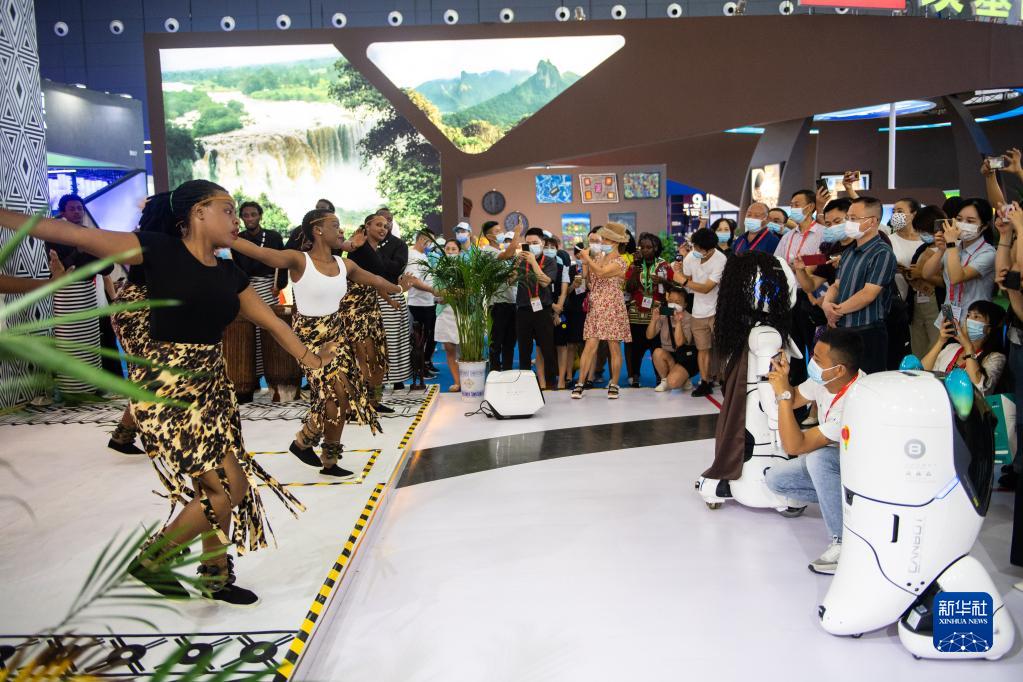 9月28日,观众们在第二届中国-非洲经贸博览会卢旺达展区观看舞蹈表演。