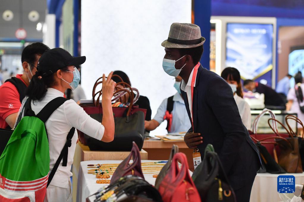 9月28日,观众在第二届中国-非洲经贸博览会非洲商品展区向参展商了解非洲商品。