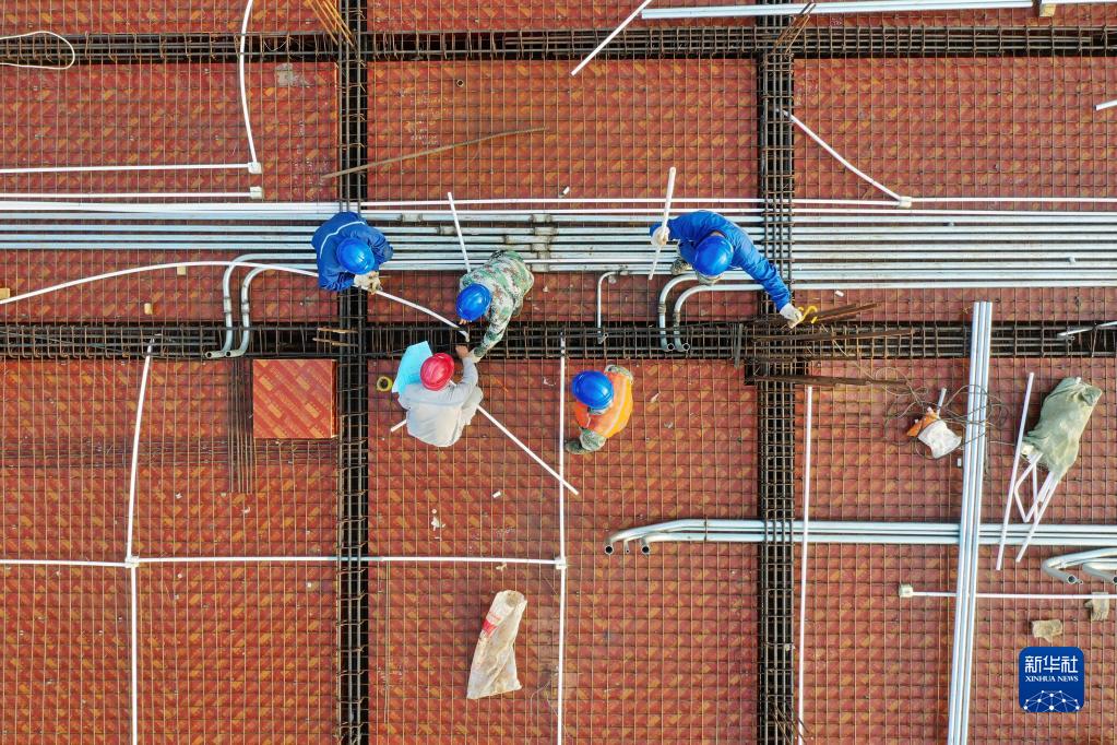 9月29日,工人在位于河北省高碑店市的雄东500千伏变电站工地施工(无人机照片)。