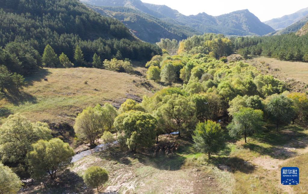 9月29日,放归自然的麋鹿进入树林中(无人机照片)。