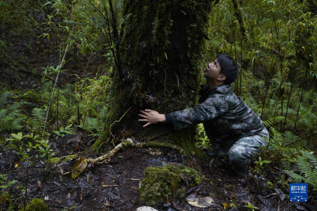 云南省昌宁县林业工作人员在对须弥红豆杉进行观测(8月26日摄)。新华社发(普文鸿 摄)