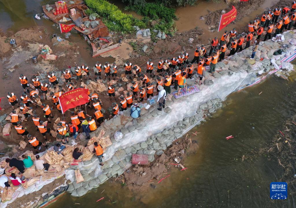 救援人员在河南省鹤壁市浚县傅庄堤上搬运沙袋,加固大堤(7月29日摄,无人机照片)。新华社记者 李安 摄