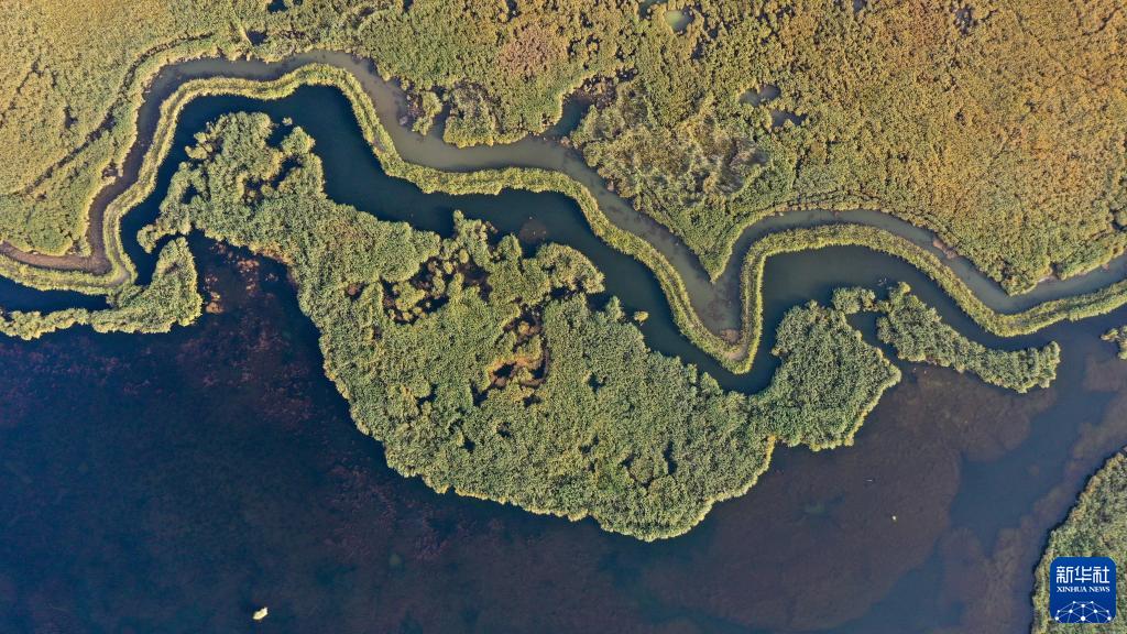 这是10月1日拍摄的新疆博斯腾湖风光(无人机照片)。