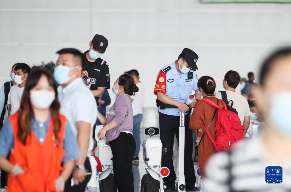 10月1日,江苏淮安东站派出所民警在候车大厅服务旅客。