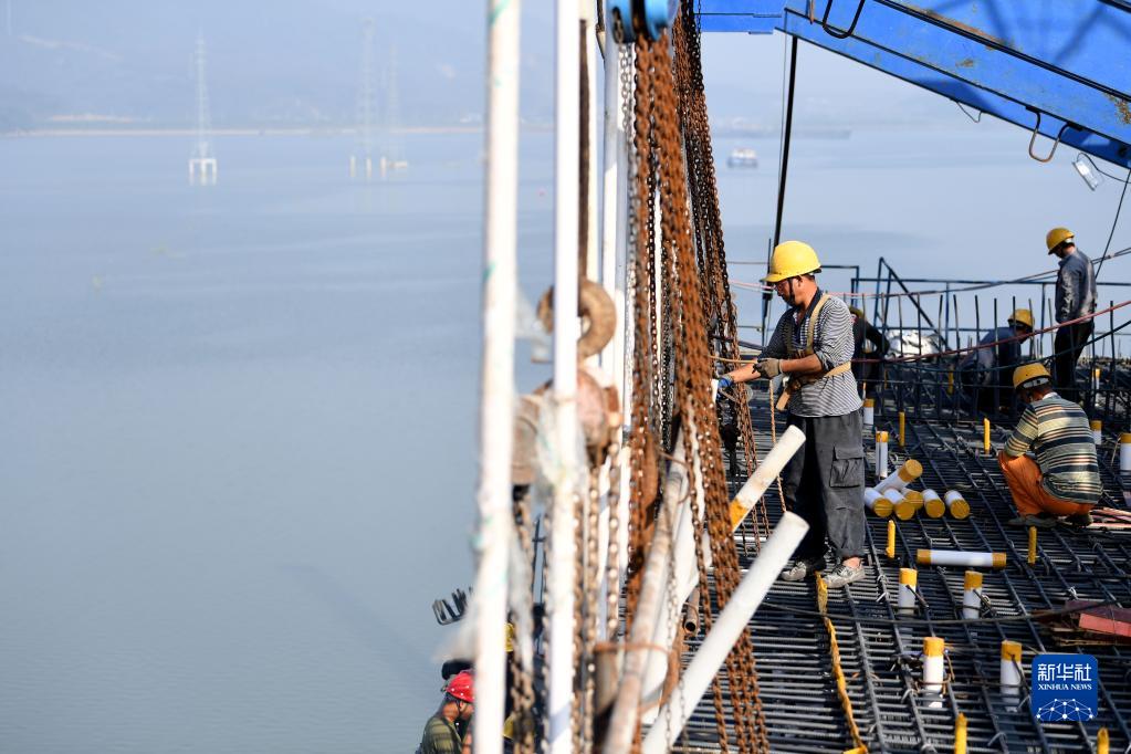 10月2日,施工人员在安徽省安庆市勇进路跨石门湖大桥项目现场施工。