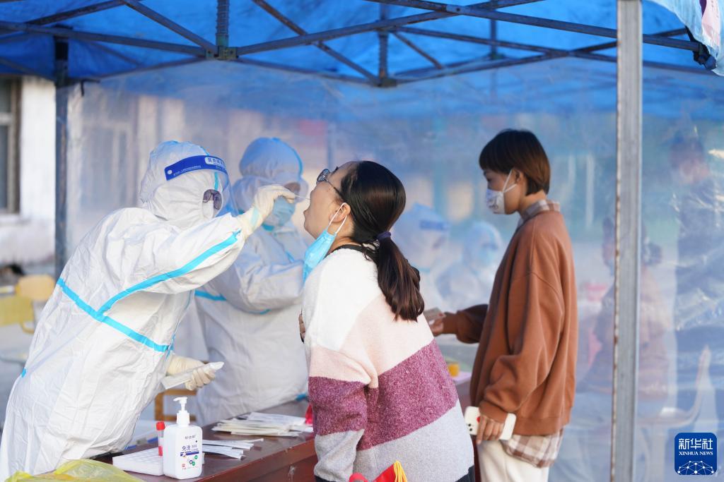 在哈尔滨市香顺社区核酸检测点,医生顾婷(左一)为居民做核酸检测(10月1日摄)。