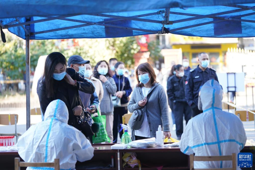 在哈尔滨市香顺社区核酸检测点,医务人员为居民做核酸检测(10月1日摄)。