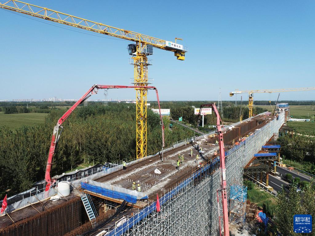 10月1日,工人在郑济高铁二标段施工现场进行连续梁浇筑。