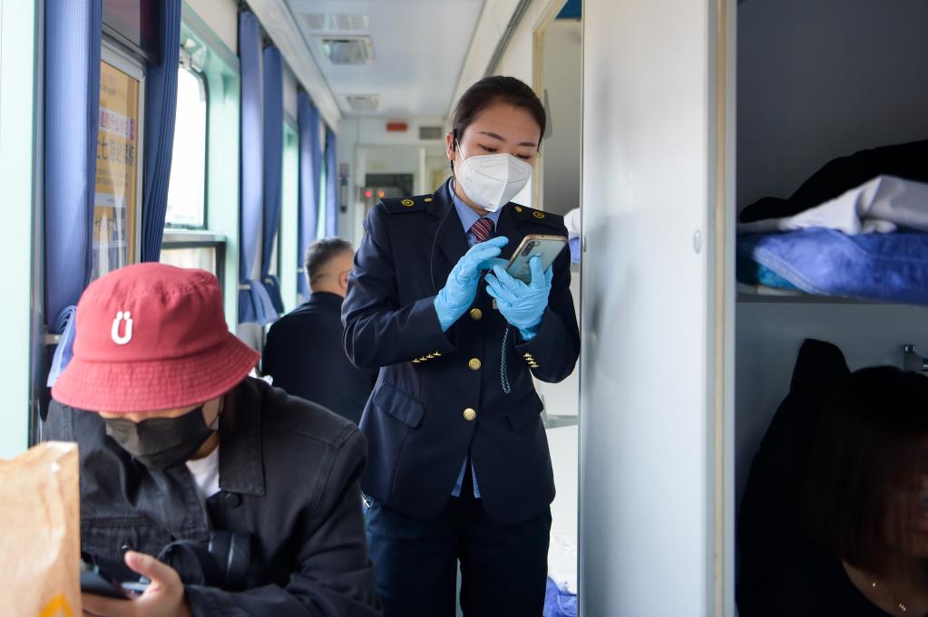 10月2日,列车员张玮晨(右)在T6307次旅客列车上核对旅客信息。