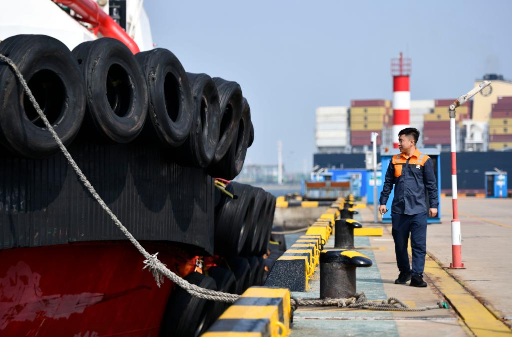 “90后”拖轮船长马国利行走在天津港轮驳有限公司码头上(10月1日摄)。