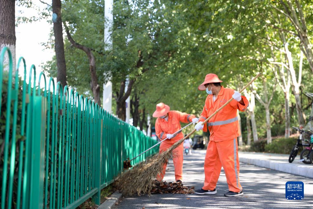 10月1日,合肥市包河区的环卫工人在清扫路面。