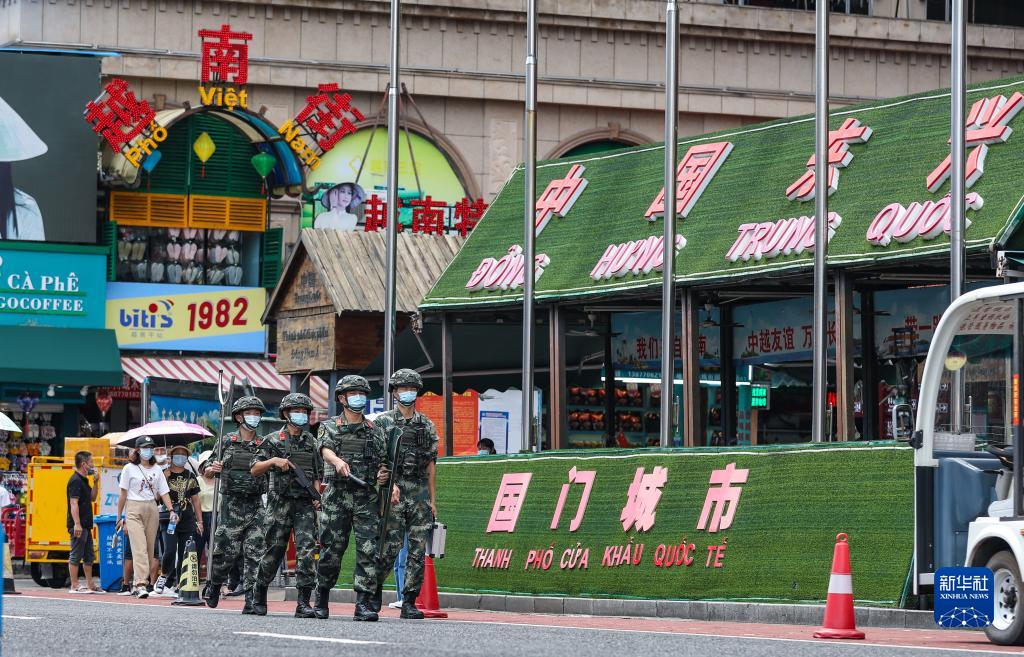 10月1日,武警广西总队防城港支队官兵在边境贸易区巡逻执勤。新华社发(徐世立 摄)