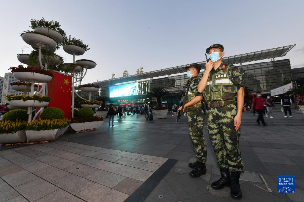 10月1日,担负国庆执勤任务的武警海南总队海口支队机动二中队官兵在海口东站站台武装警戒。新华社发(雷辙 摄)