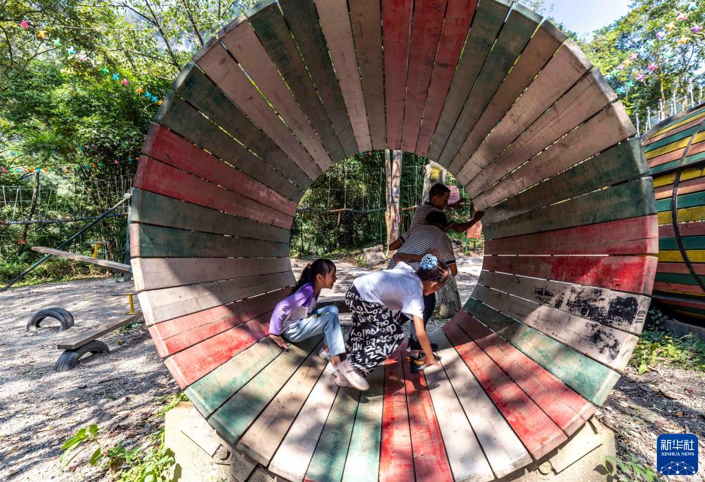 10月2日,小朋友在贵阳市开阳县南江大峡谷景区游乐场玩耍。