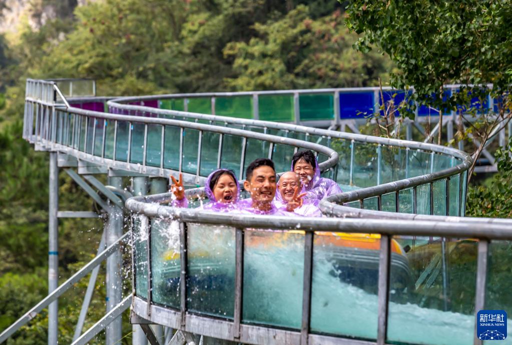 10月2日,游客在贵阳市开阳县南江大峡谷景区体验玻璃滑道。