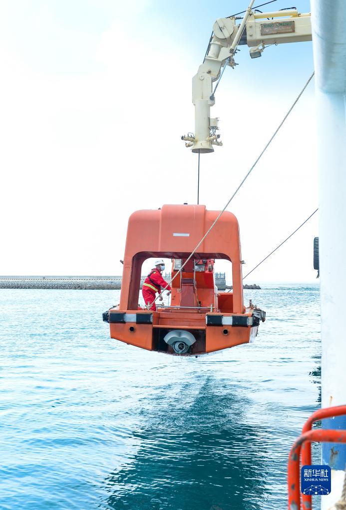 10月1日,“南海救115”轮船员在西沙海域开展模拟演练后收回救助艇。