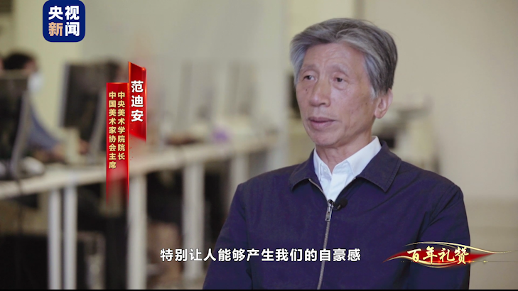 中国美术家协会主席、中央美术学院院长 范迪安:我们觉得从小小红船到巍巍巨轮,总书记讲的这句话特别让人能够产生我们的自豪感,特别富有历史的宽阔度,也特别具有从今天面向未来,走向未来的这种雄心壮志。