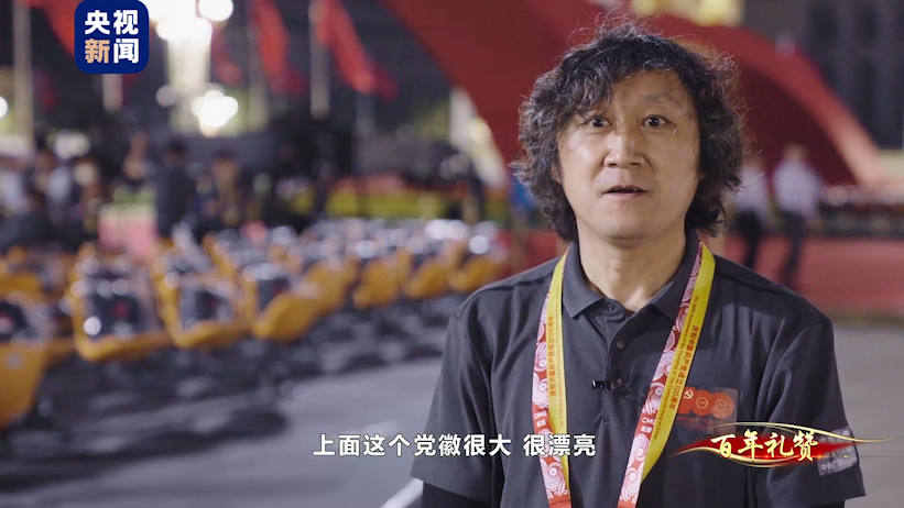 中央广播电视总台转播团队摄像 侯鑫强:就是一个无实物的拱门,上面并没有党徽,因为还没架上去。我们只是在想,上面这个党徽很大、很漂亮。等那天架上去长镜头走完的时候,我们当时内心都很激动,旁边看着的人也都很激动,导演组当时对这个镜头的要求是又要有政治的表达,又要有艺术化的表达,我们确实是做到了。