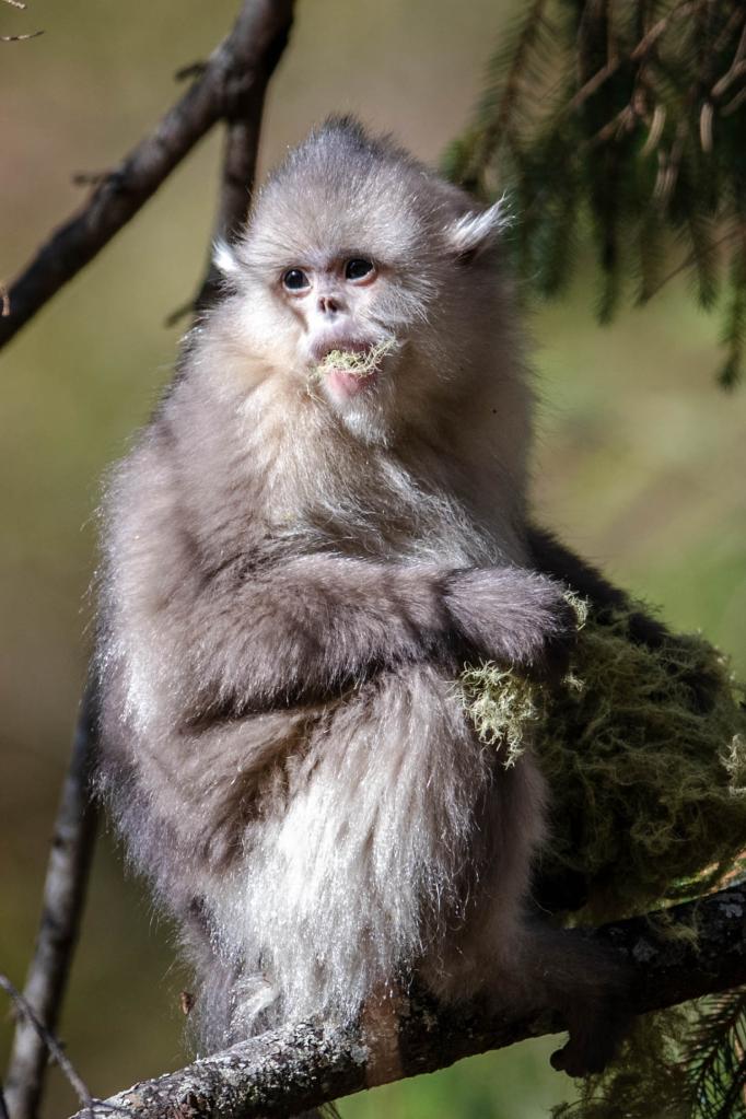 “人脸红唇”的外形“得益”于它们的头顶长有尖形黑色冠毛,而眼周和吻鼻部却呈青灰色或肉粉色。一只成年滇金丝猴一般体长51-83厘米,尾长52-75厘米,其皮毛以灰黑、白色为主。