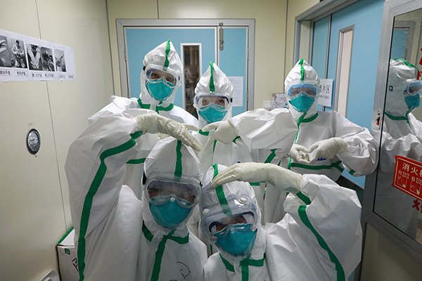 2020年1月30日,海军军医大学医疗队重症监护室医护人员在进入ICU前合影。新华社发 陈晨 摄